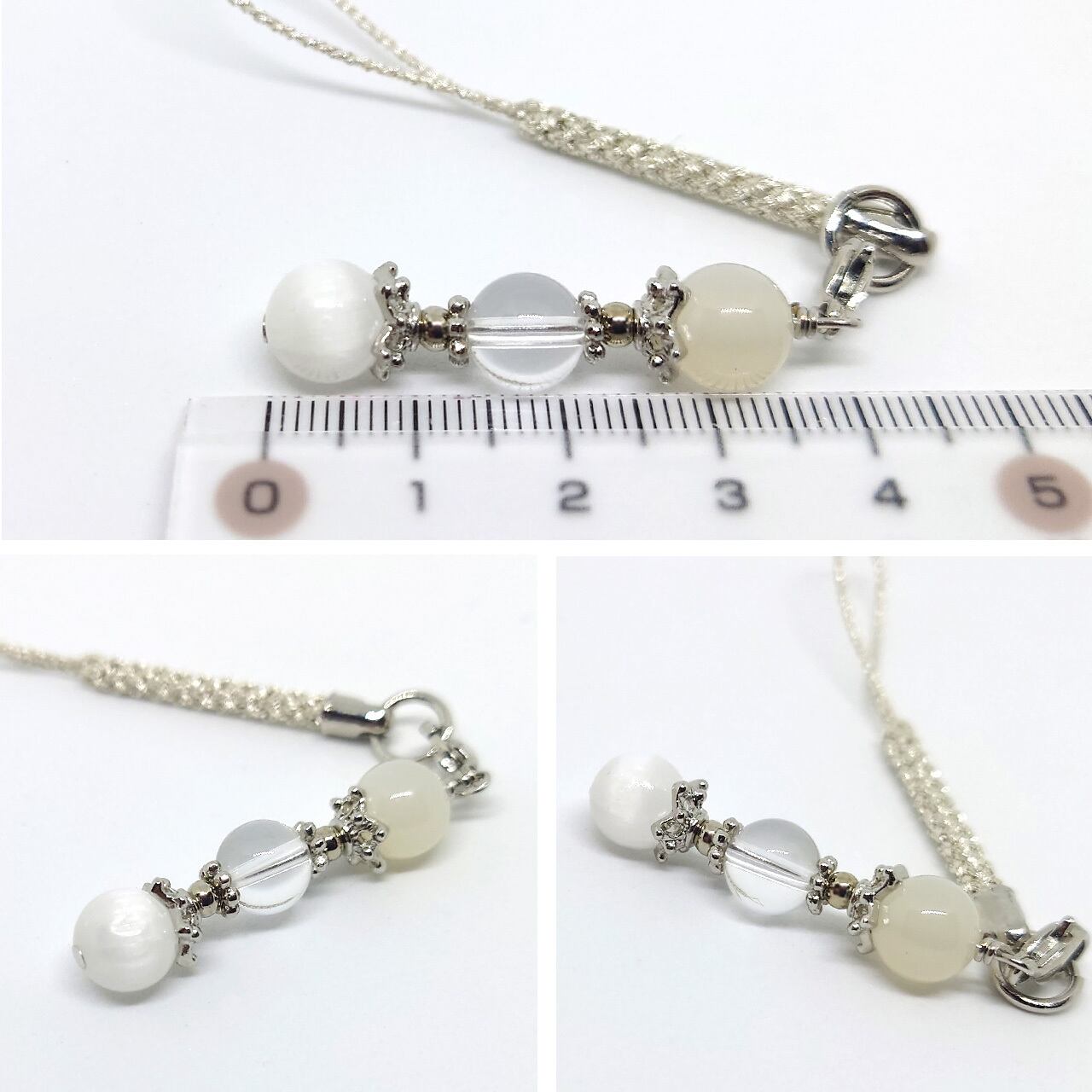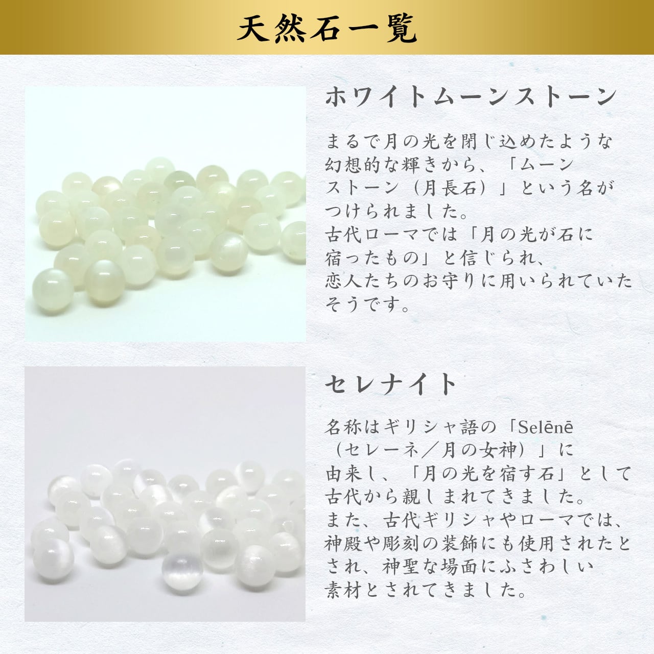 ホワイトムーンストーンは、乳白色のやわらかな光沢を持つ天然石で、角度によって光がふんわりと流れるように見えるシラー(光の帯)が特徴です。まるで月の光を閉じ込めたような幻想的な輝きから、「ムーンストーン(月長石)」という名がつけられました。