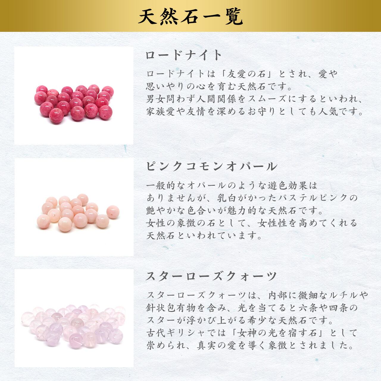 ロードナイト、ピンクコモンオパール、スターローズクォーツ。