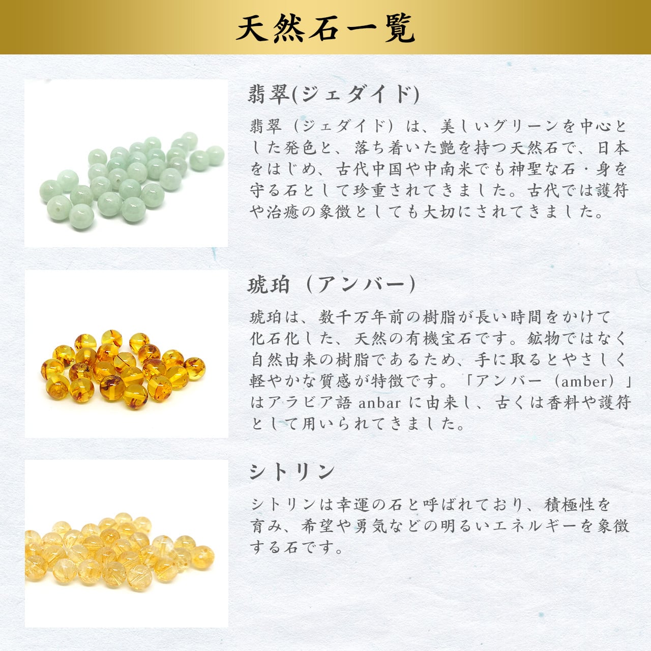 翡翠の深みのあるグリーンはしっとりとした艶を、琥珀は半透明の蜂蜜色が柔らかさを、シトリンは淡い黄金色で手元に明るさを添えます。
