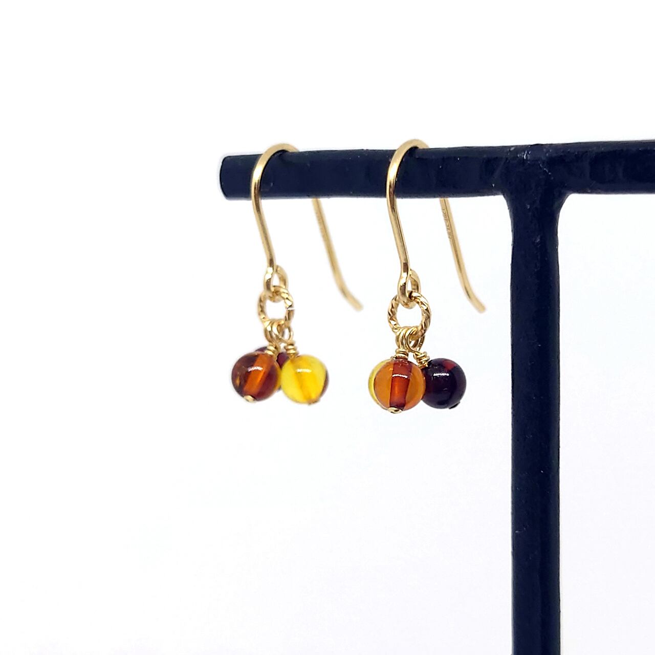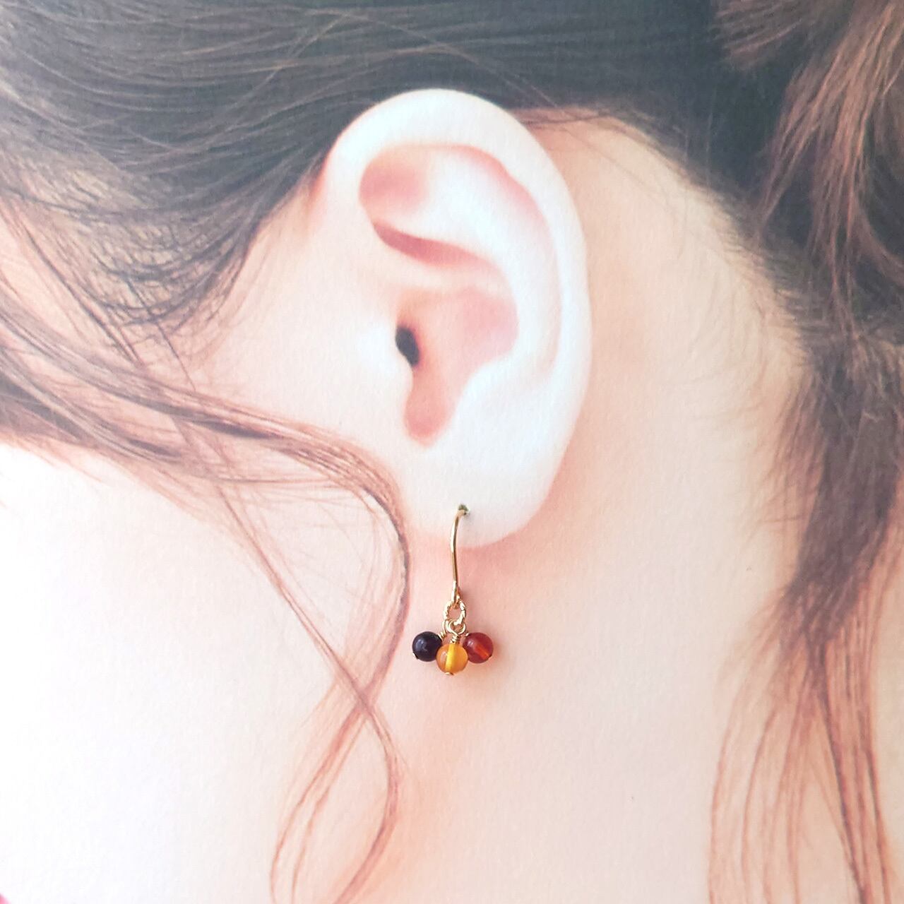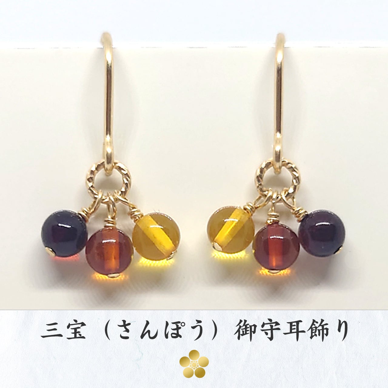 色合いの異なる三粒の琥珀が、耳元でそっと揺れる三宝(さんぽう)お守りピアスです。