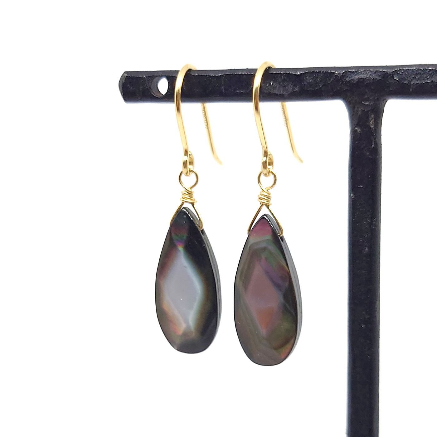 露珠(ろしゅ)お守りピアス|14kgf タヒチ産黒蝶貝 AAA(ブラックシェル) ペアシェイプ ファセットカット