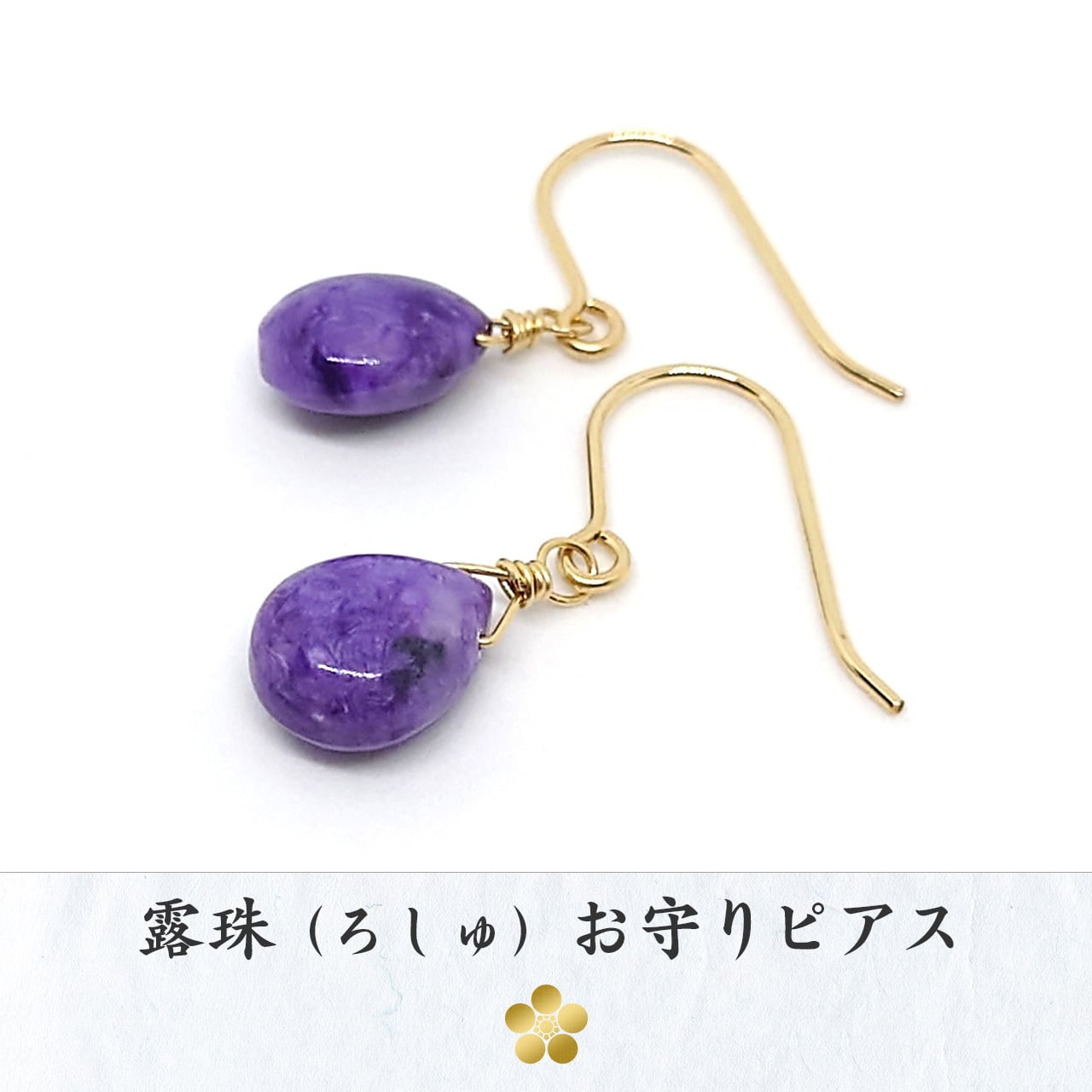 ロシア産チャロアイトを用い、仏教の装身具に由来する「露珠(ろしゅ)」のかたちをモチーフに仕立てたお守りピアスです。